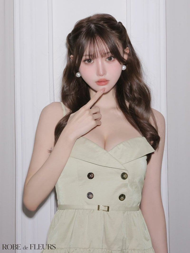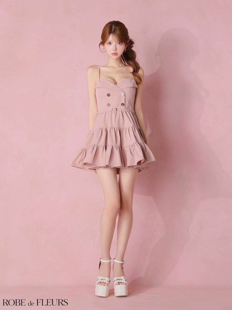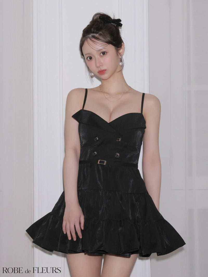 ふんわりフレアでドーリーに♡ [ROBEdeFLEURS/ローブドフルール] 高級 ブランド Aラインミニドレス 谷間 キャミソール ウエストベルト ダブルボタン ティアード ワンカラー
