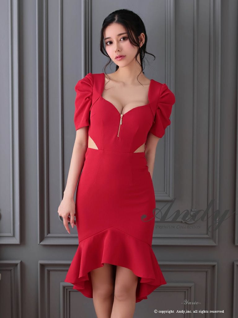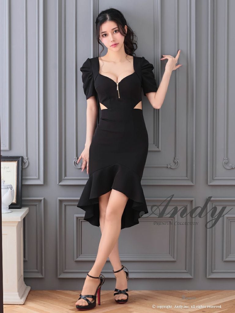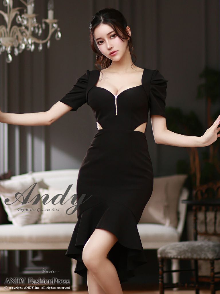 キャバドレス Andy アンディ 高級フロントジップウエストカット半袖フリルテールマーメイドタイト膝丈ドレス
