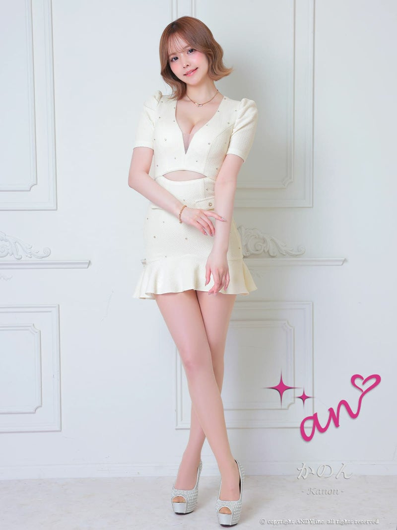 キャバドレス an アン高級 半袖 バストカット ウエストカット ビジュー シアー 裾フリル タイトミニドレス