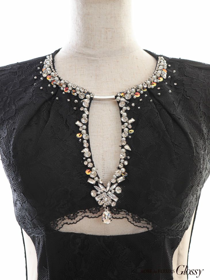 5. [ROBEdeFLEURSGlossy/ローブドフルールグロッシー] 高級ノースリーブバスト×ウエストカットデザインくびれチュール切替総レースタイトミニドレス