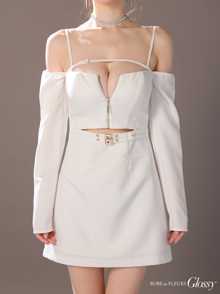 sexyデザインでクールな印象に♡ [ROBEdeFLEURSGlossy/ローブドフルールグロッシー] 高級 ブランド タイトミニドレス 長袖 谷間 肩出し ウエストベルト ウエストカット 2way ジップ バストカット