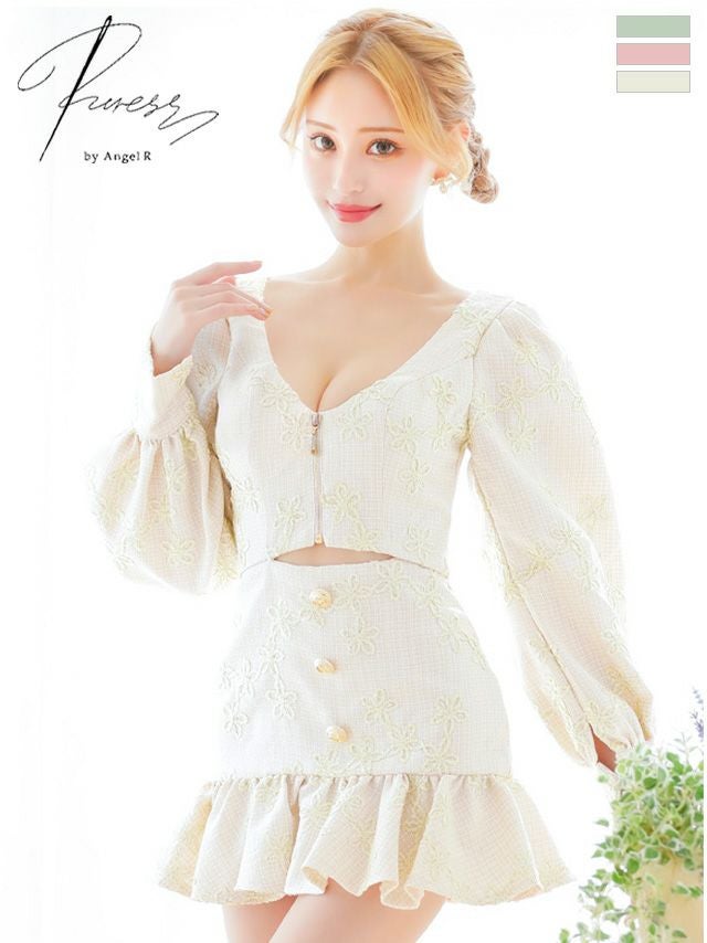 トレンド感溢れるマイクロミニドレス☆ [PURESS/ピュアレス] 高級フラワー刺繍ツイードジップウエストカット裾フリル長袖 袖ありフレアミニドレス