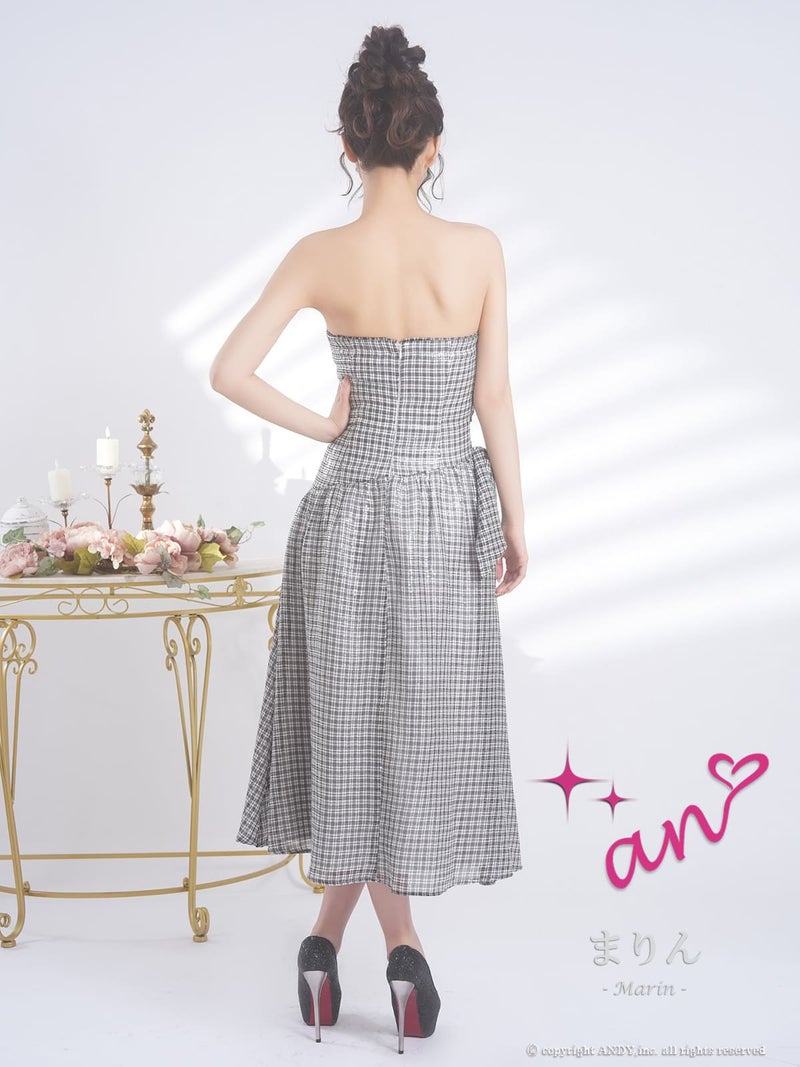 4. [an/アン] 高級 ノースリーブ フレアロングドレス ウエストカット チェック柄 ウエストリボン ベアトップ