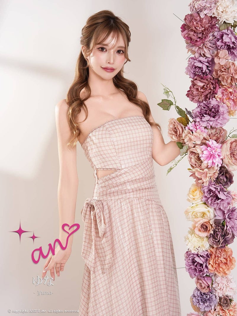 キャバドレス an アン 高級 ノースリーブ フレアロングドレス ウエストカット チェック柄 ウエストリボン ベアトップ