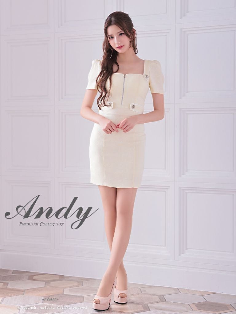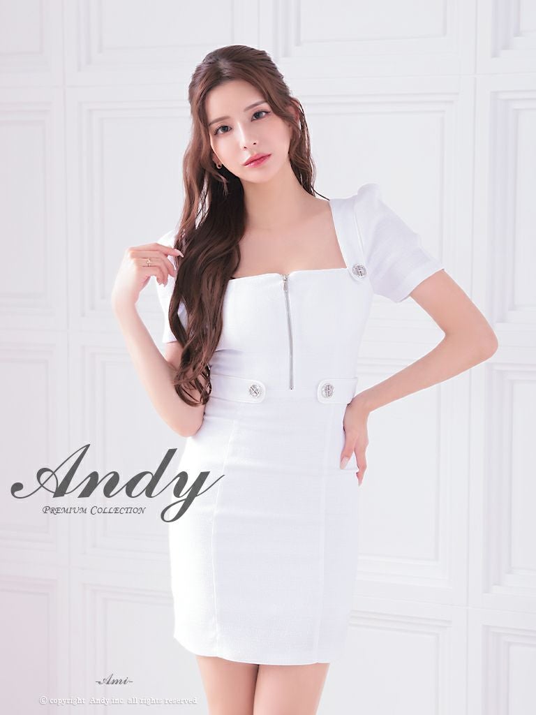 キャバドレス Andy アンディ 高級半袖スクエアネックフロントジップウエストリボンタイトミニドレス