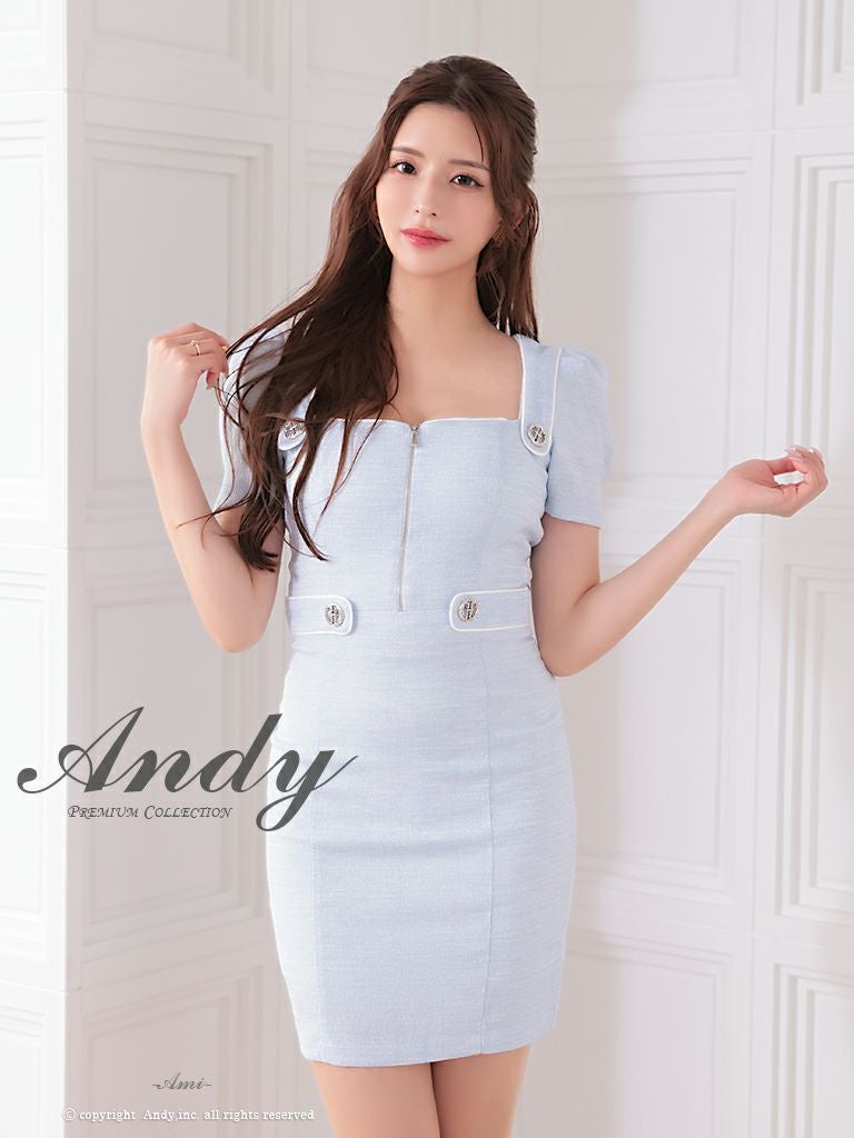キャバドレス Andy アンディ 高級半袖スクエアネックフロントジップウエストリボンタイトミニドレス