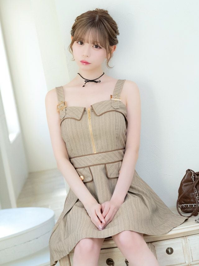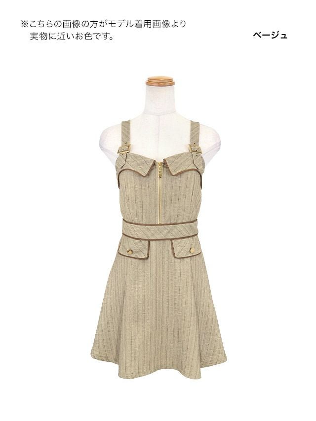 2/5新作★トレンチ風ディティールでお洒落映え◎ ミニドレス Aライン キャミソール ワンピース 同伴 ジップ 谷間 ストライプ パイピング ベージュ XL キャバドレス (若林萌々着用) [tk-md271302]