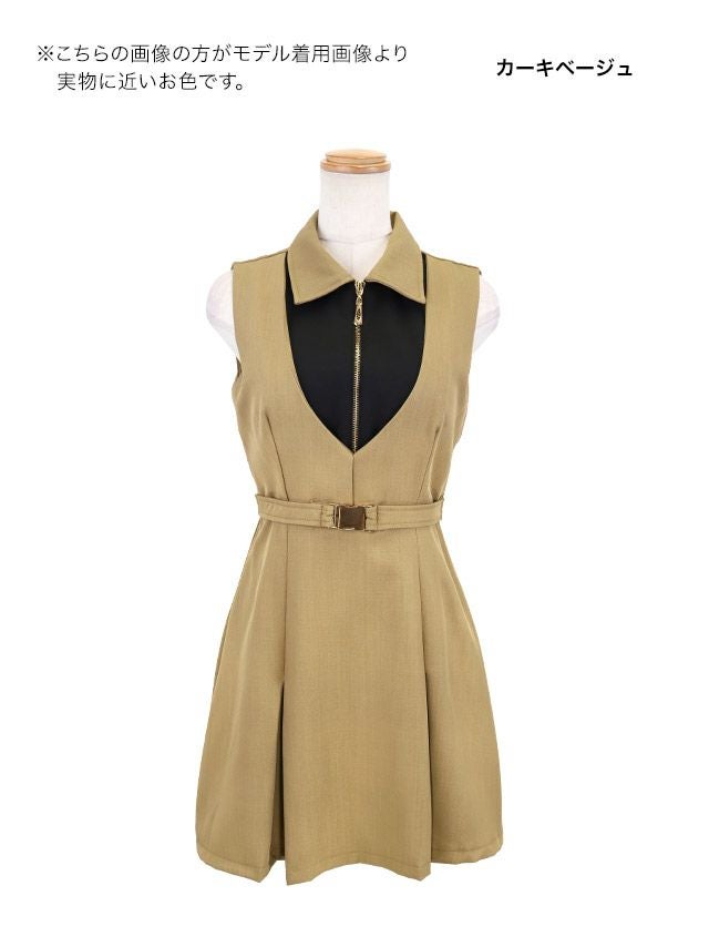 ミニドレス Aライン ノースリーブ ワンピース 同伴 ジップ 谷間 襟付き ベルト付き ブラジャーのまま 大きいサイズ XL XXL カーキ ベージュ キャバドレスのカラーバリエーション