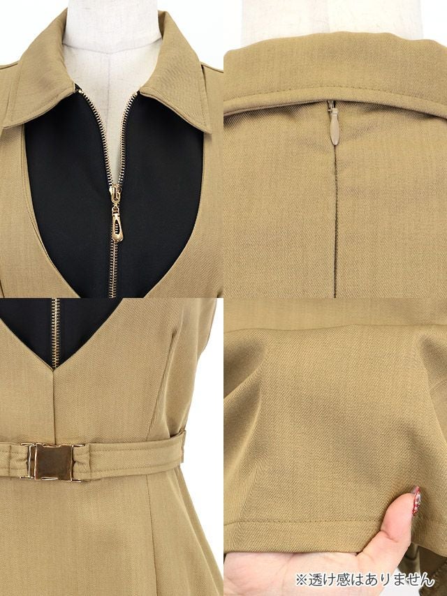 5. ミニドレス Aライン ノースリーブ ワンピース 同伴 ジップ 谷間 襟付き バイカラー ベルト付き ブラジャーのまま 大きいサイズ XL XXL カーキ ベージュ キャバドレス (若林萌々着用) [tk-mdij2213]