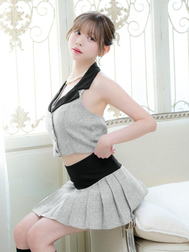 2/3新作★ヘルシーな可愛さ炸裂♡ ミニドレス Aライン セットアップ ホルターネック 襟付き プリーツ バイカラー グレー XL キャバドレス (若林萌々着用) [tk-mdslb6004]
