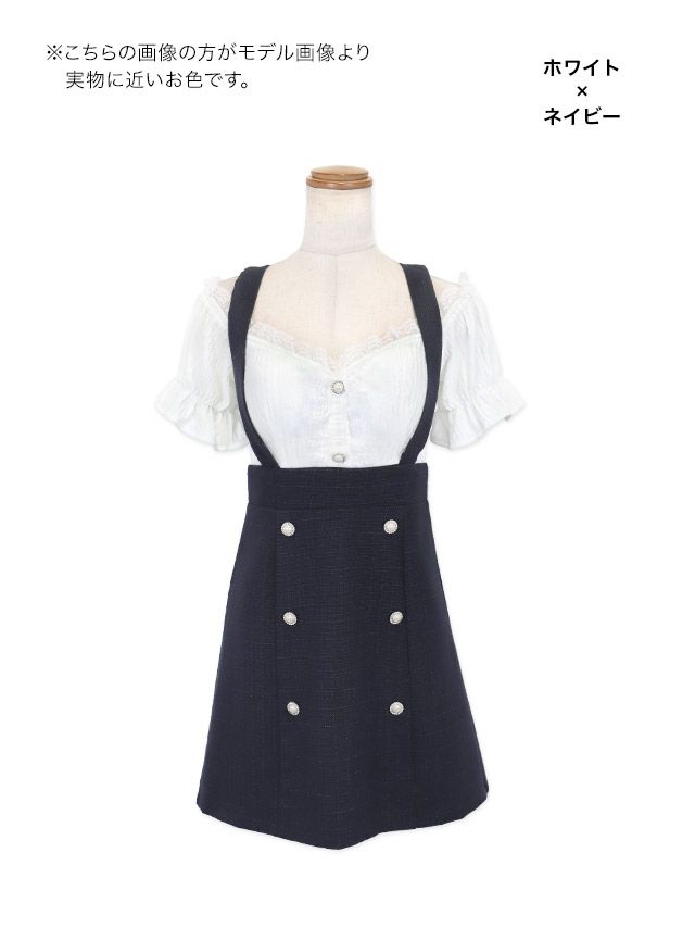 肩あきシフォンパフスリーブ切り替えツイードダブルボタンサロペット風フレアミニドレスのカラーバリエーション