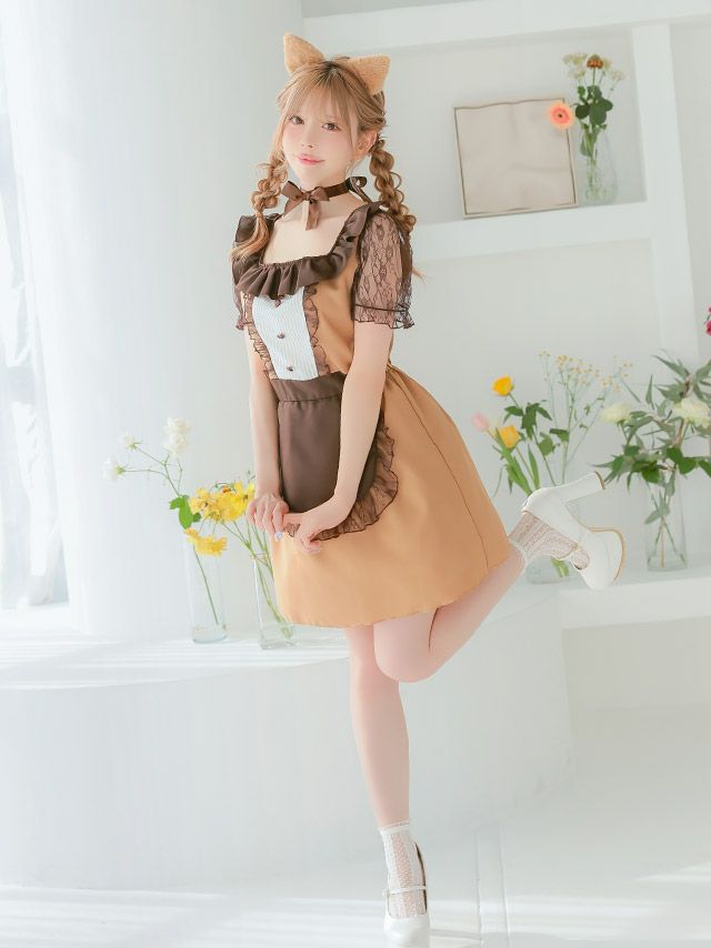 3点set メイドデザインキャラメルキティフレアスカートガーリー猫アニマルコスプレのメイン画像