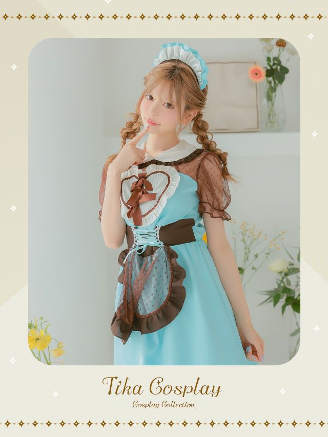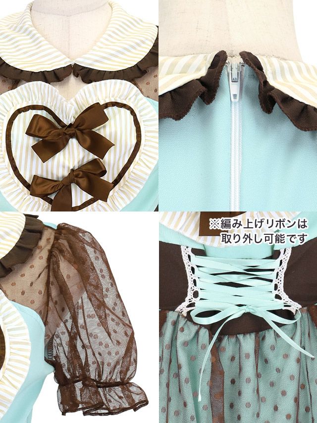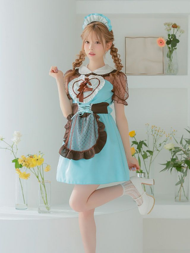 5. SALE [コスプレ] メイド コスプレ 体型カバー ガーリー フレアスカート チョコミント 3点セット (ワンピース/カチューシャ/リボン)