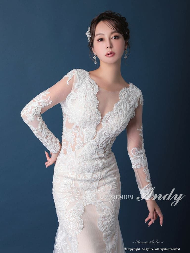 キャバドレスPREMIUM Andy プレミアムアンディ  高級 長袖 刺繍 レース バックカット マーメイド バースデー タイト ロングドレス