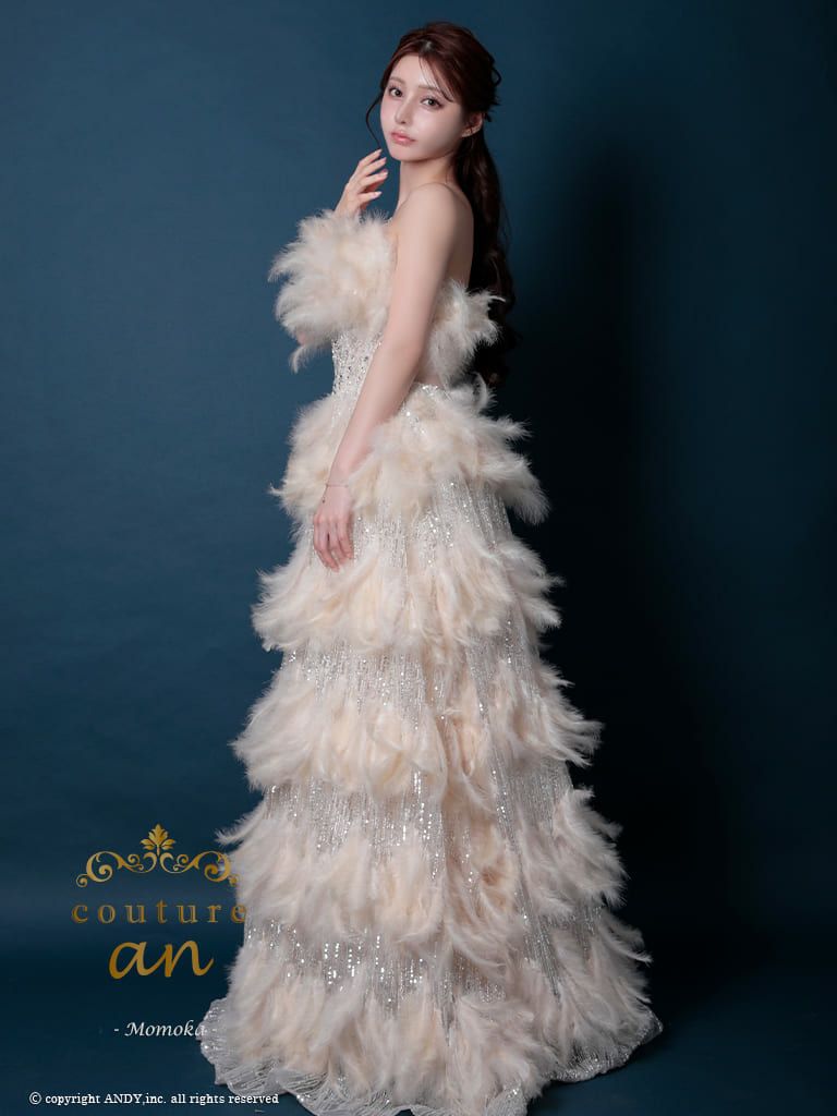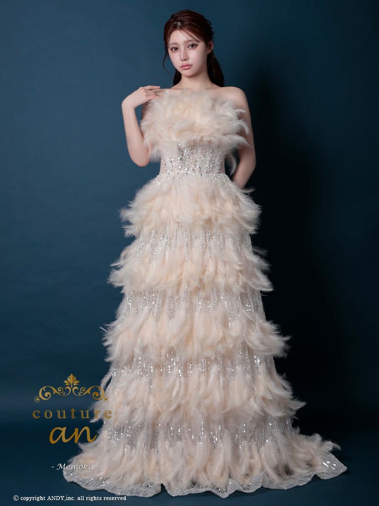 たっぷりフェザーがゴージャスな特別なドレス☆ [couture an/クチュールアン] 高級 バースデー ベアデザイン フェザー ビジュー スパンコール ラメ Aラインロングドレス