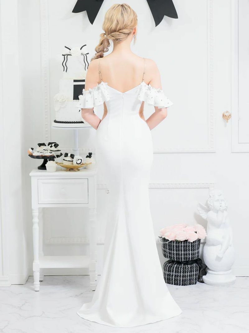 5. [Angel-R/エンジェルアール] 高級 肩出し 二の腕カバー フリル くびれ フラワービジュー バストカット 谷間魅せ タイトロングドレス