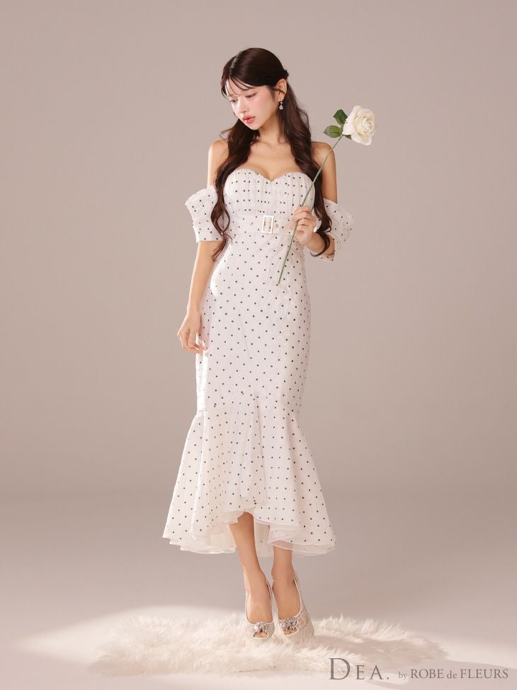 6. [DEA.byROBEdeFLEURS/ディアバイローブドフルール] 高級ドット柄オフショルダーウエストベルトマーメイドタイトロングドレス