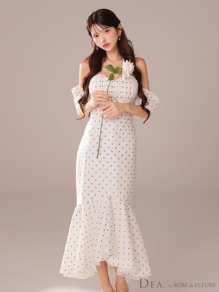 5. [DEA.byROBEdeFLEURS/ディアバイローブドフルール] 高級ドット柄オフショルダーウエストベルトマーメイドタイトロングドレス