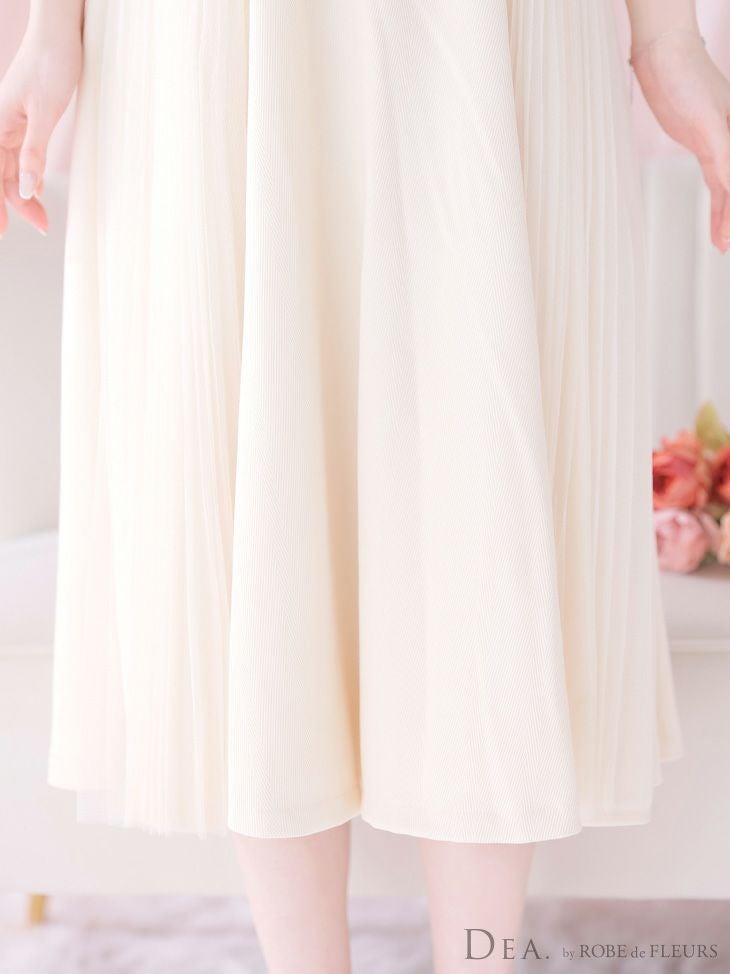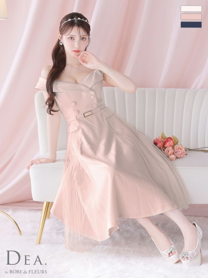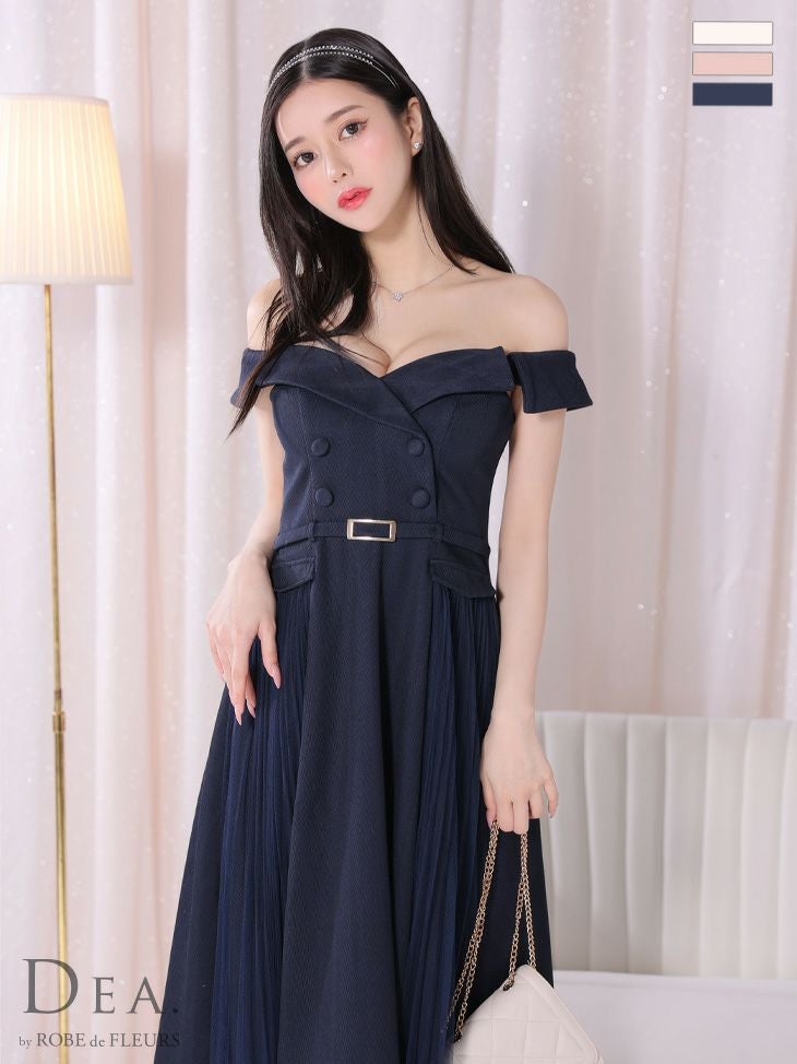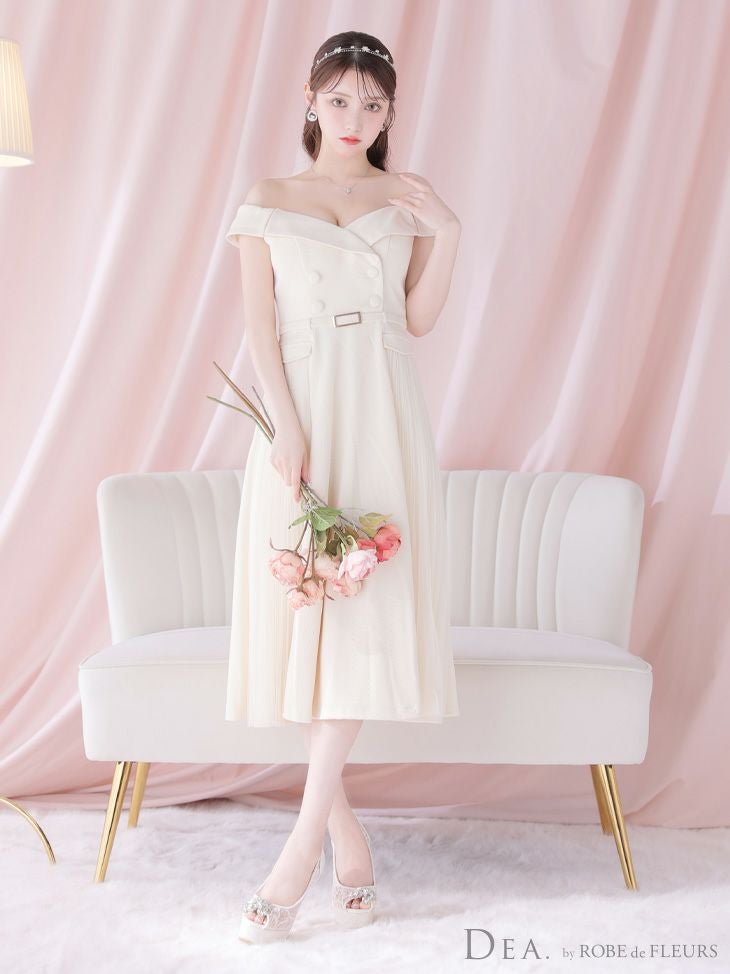 オフショルダーが女性らしく美しい♪ [DEA.byROBEdeFLEURS/ディアバイローブドフルール] 高級 オフショルダー ウエストベルト ダブルボタン サイドチュール Aライン 膝丈ドレス