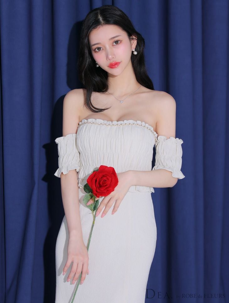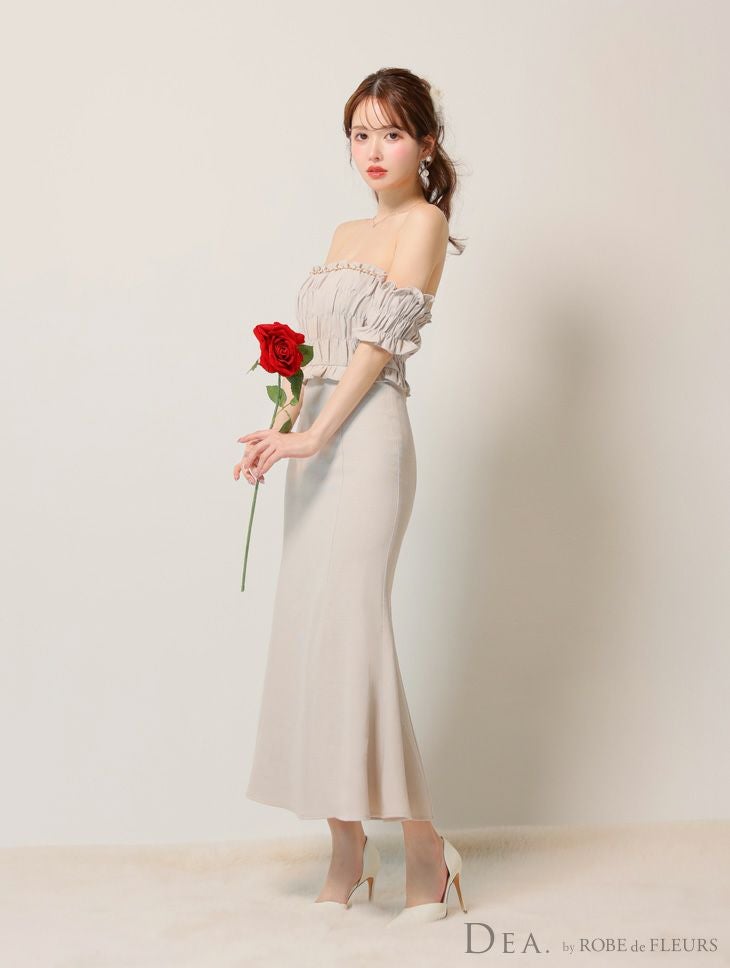 4. [DEA.byROBEdeFLEURS/ディアバイローブドフルール] 高級オフショルダーフロントチェーンラメツイルギャザータイトロングドレス