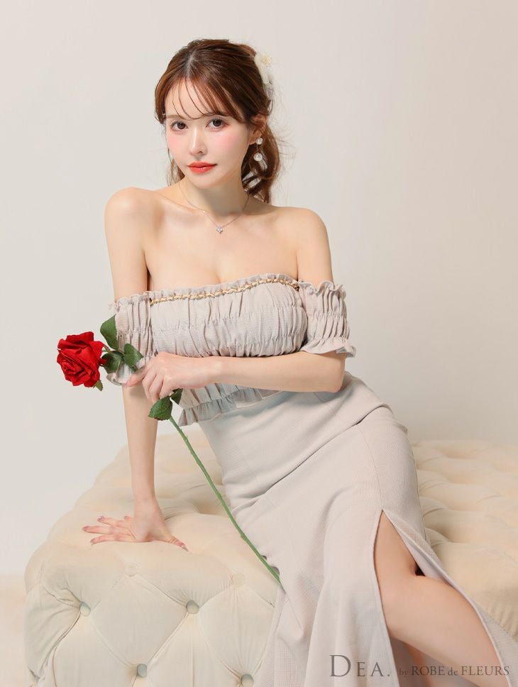 5. [DEA.byROBEdeFLEURS/ディアバイローブドフルール] 高級オフショルダーフロントチェーンラメツイルギャザータイトロングドレス
