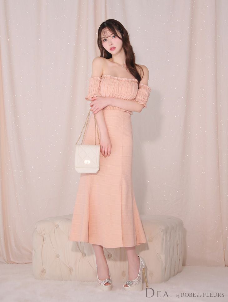 フロント部分のチェーンが可愛い☆ [DEA.byROBEdeFLEURS/ディアバイローブドフルール] 高級オフショルダーフロントチェーンラメツイルギャザータイトロングドレス