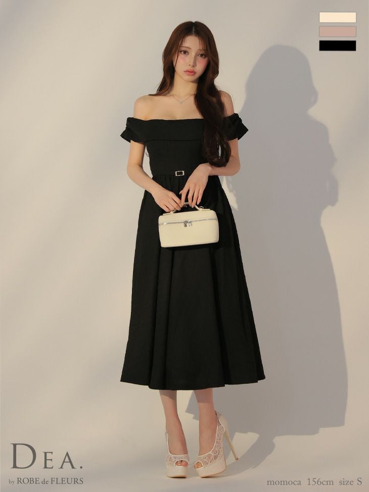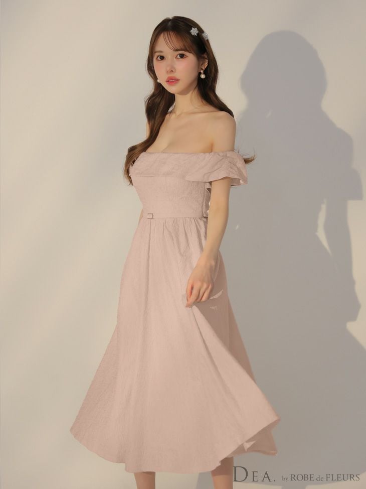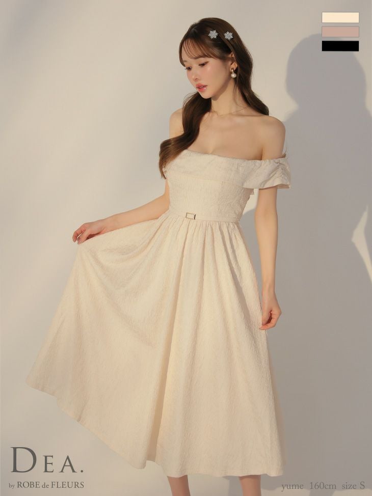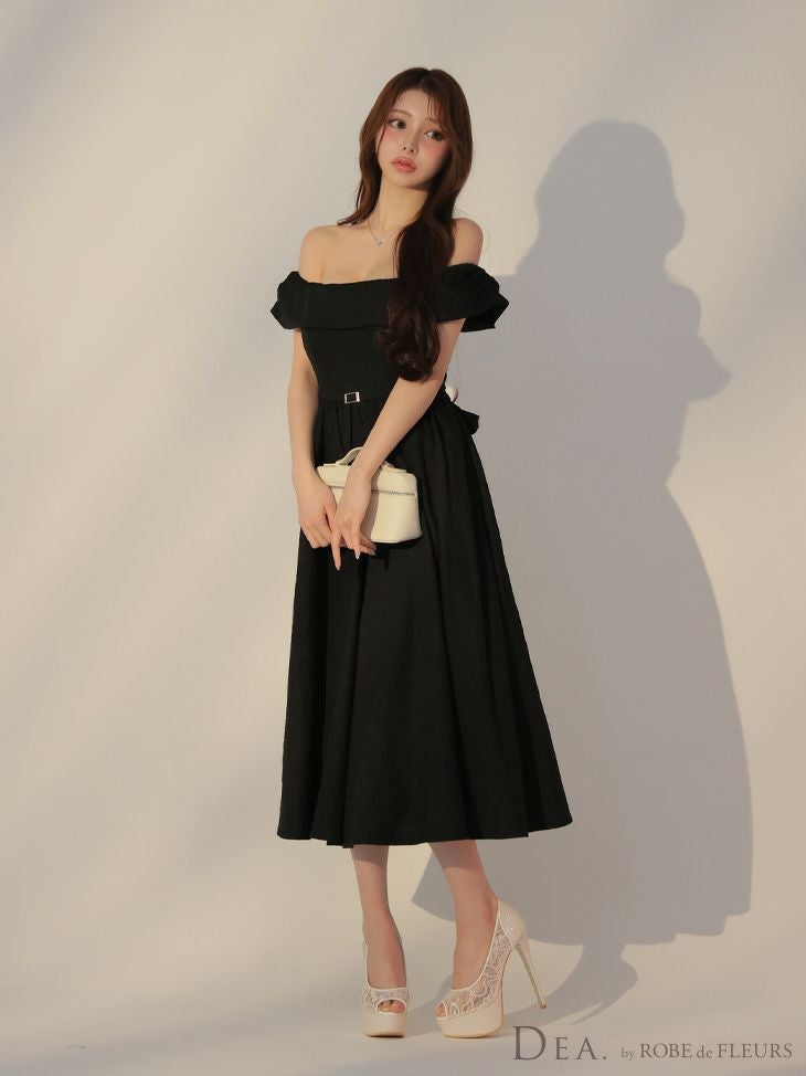 上品な肌見せを叶える♡ [DEA.byROBEdeFLEURS/ディアバイローブドフルール] 高級 ジャガード バックリボン ウエストベルト オフショルダー Aライン 膝丈ドレス
