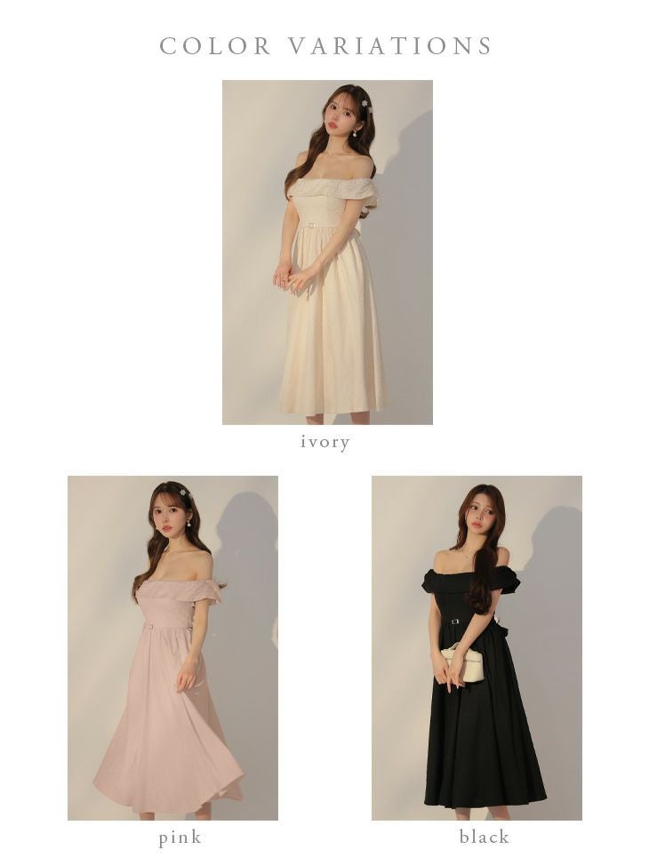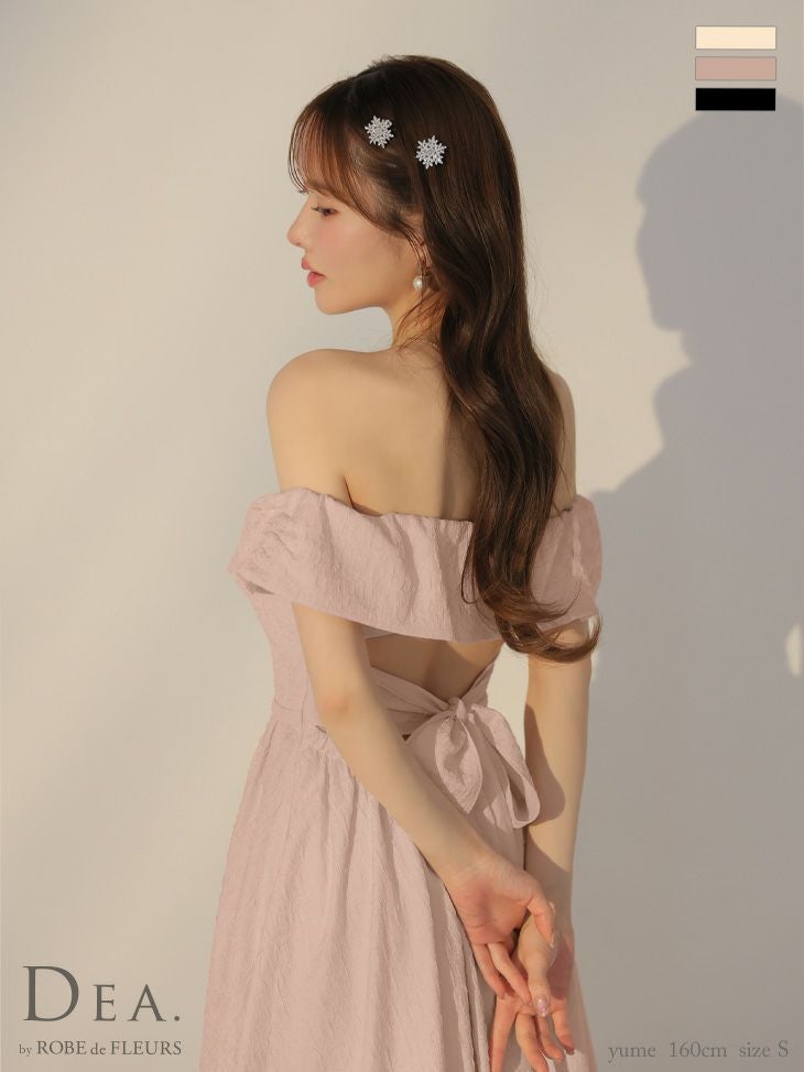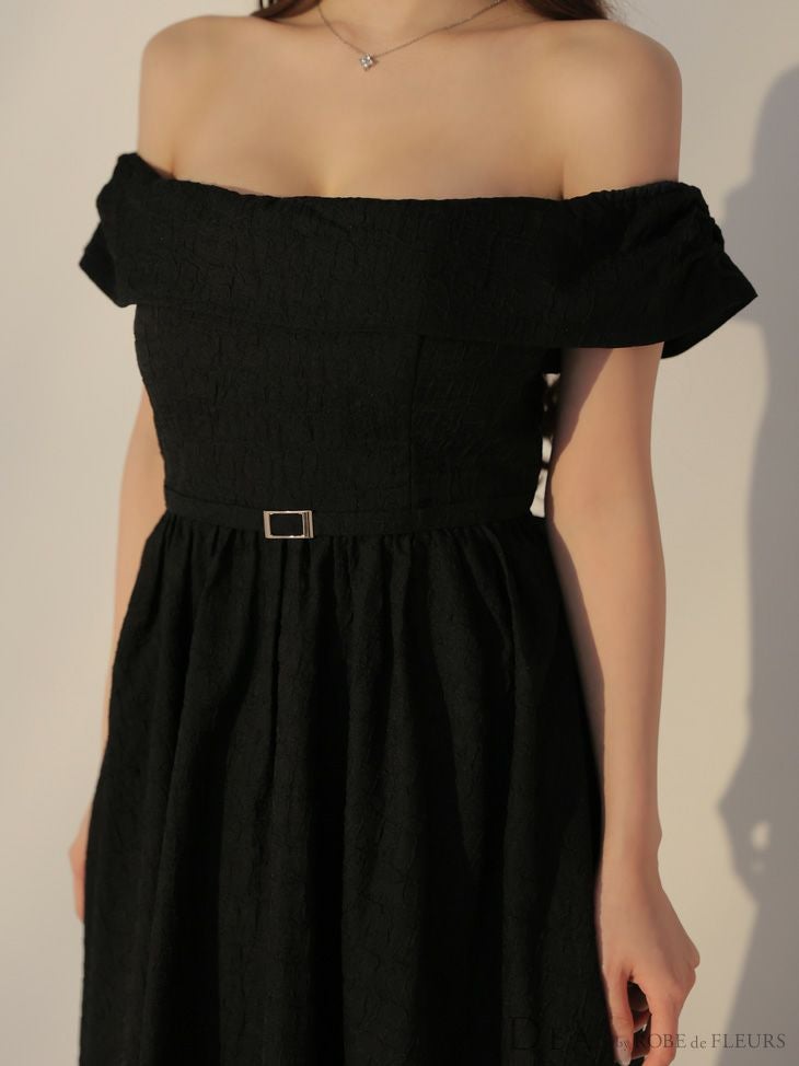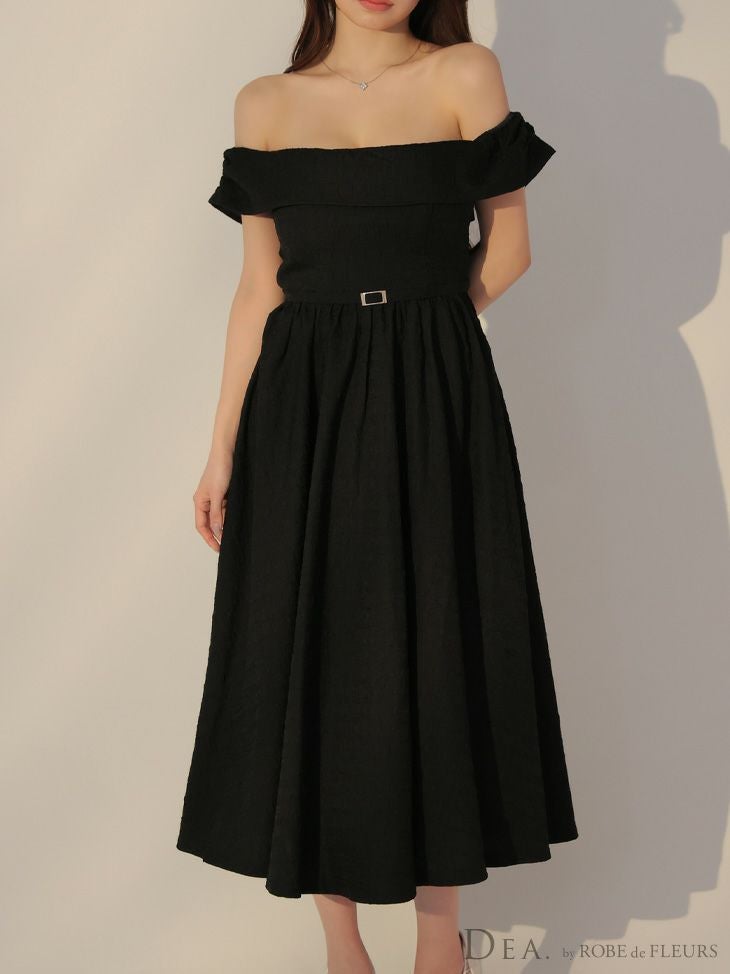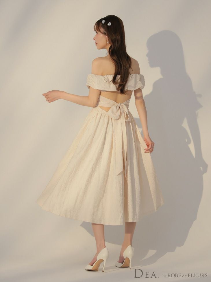 上品な肌見せを叶える♡ [DEA.byROBEdeFLEURS/ディアバイローブドフルール] 高級 ジャガード バックリボン ウエストベルト オフショルダー Aライン 膝丈ドレス