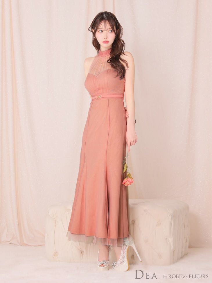 6. [DEA.byROBEdeFLEURS/ディアバイローブドフルール] 高級 バストシースルー ホルターネック ウエストベルト ネックリボン チュール 谷間魅せ Aラインロングドレス