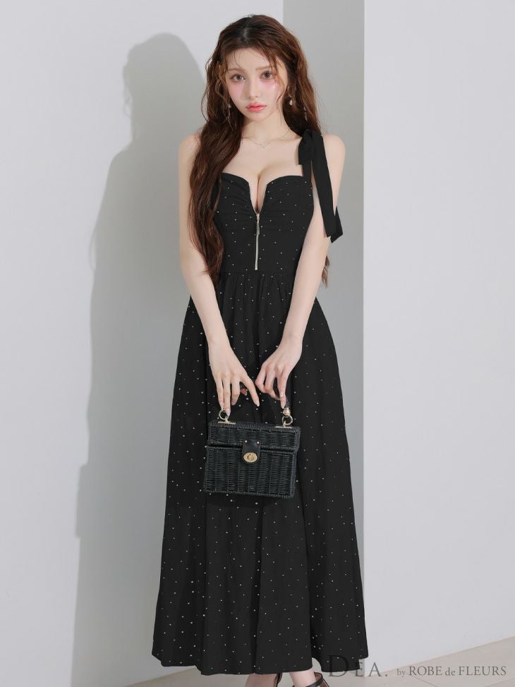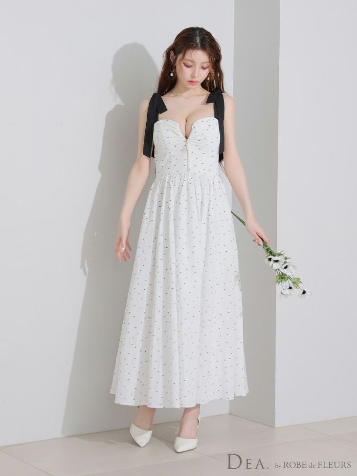 身に纏うだけで上品レディに♡ [DEA.byROBEdeFLEURS/ディアバイローブドフルール] 高級 ブランド ワンピース Aラインロングドレス キャミソール ドット柄 ジップ ショルダーリボン