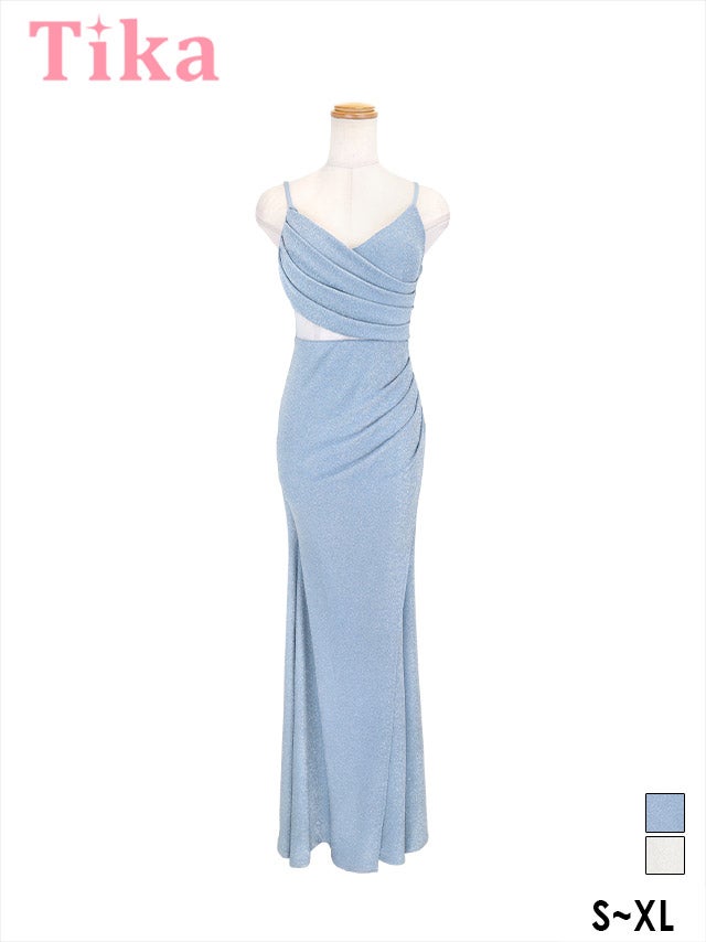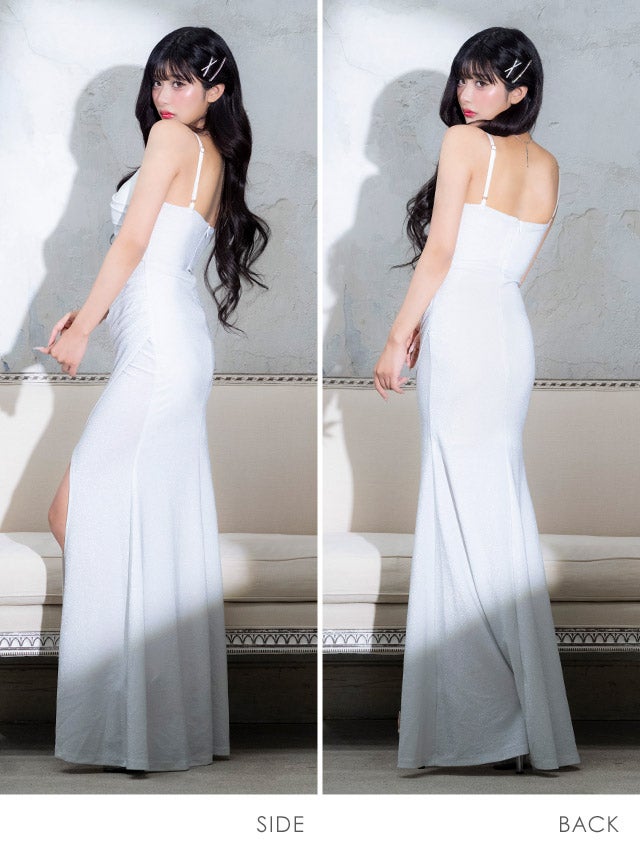 3. ロングドレス タイト キャミソール ギャザー ウエストカットアウト ストレッチ グリッターラメ ラップ スリット 大きいサイズ シルバー XL キャバドレス (横田未来着用) 【tk-ld77018】