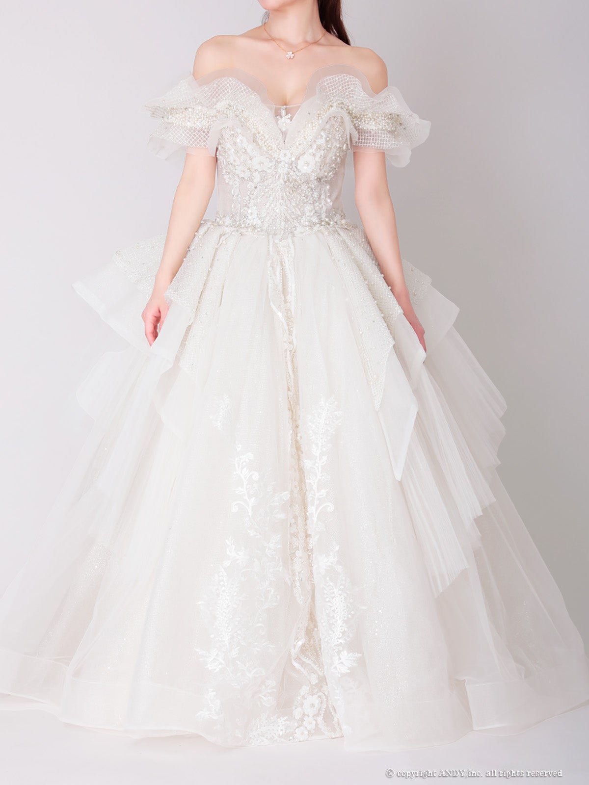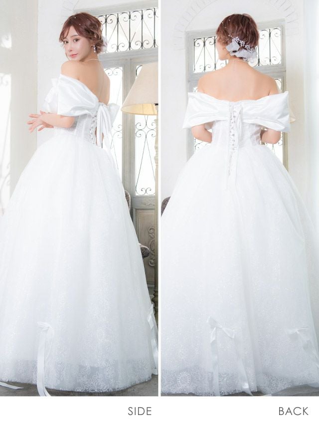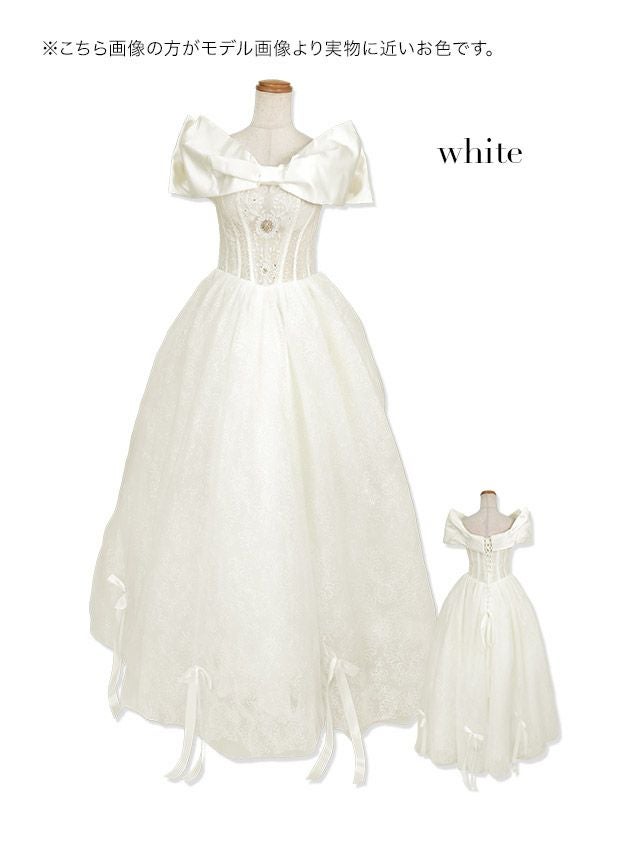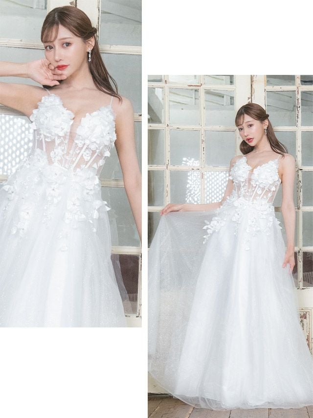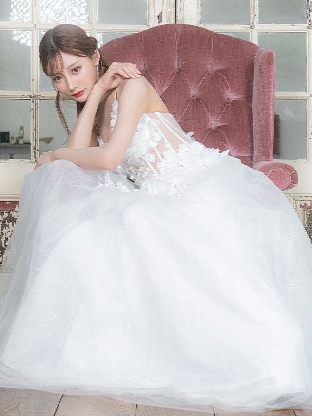 ロングドレスが持つ優雅で流れるようなシルエットに、白の持つ無垢な輝きが加わることで、神々しいまでのオーラを放ちます。