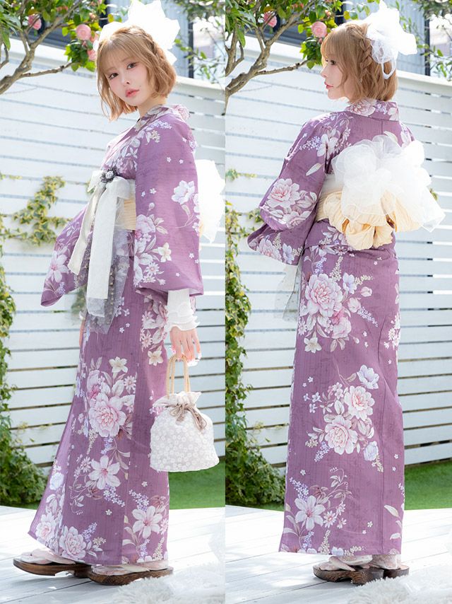 3. [浴衣] ラズベリー アンティークフラワー 2025 SWEETシリーズ 3点セット 戦慄かなの着用 (ゆかた・兵児帯・下駄)