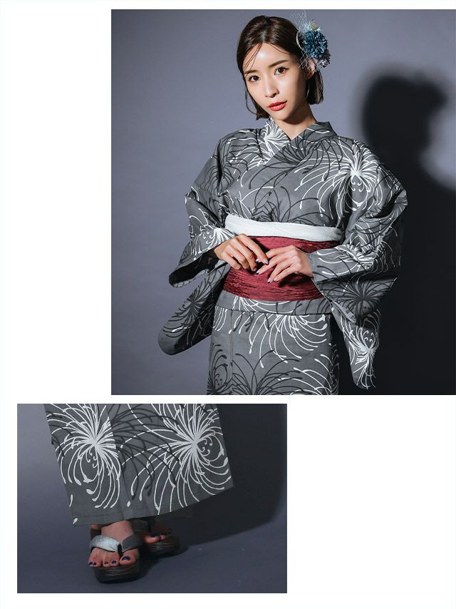 多くの浴衣は「浴衣+帯」または「浴衣+帯+下駄」の3点セットになっています。商品ごとにセット内容が異なるため、各ページの詳細をご確認ください。