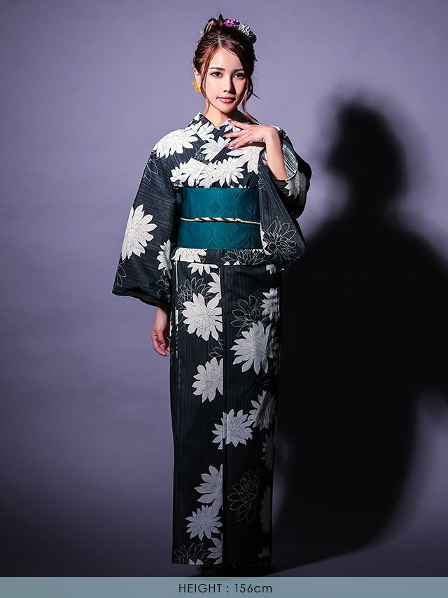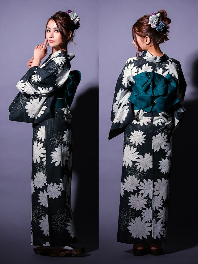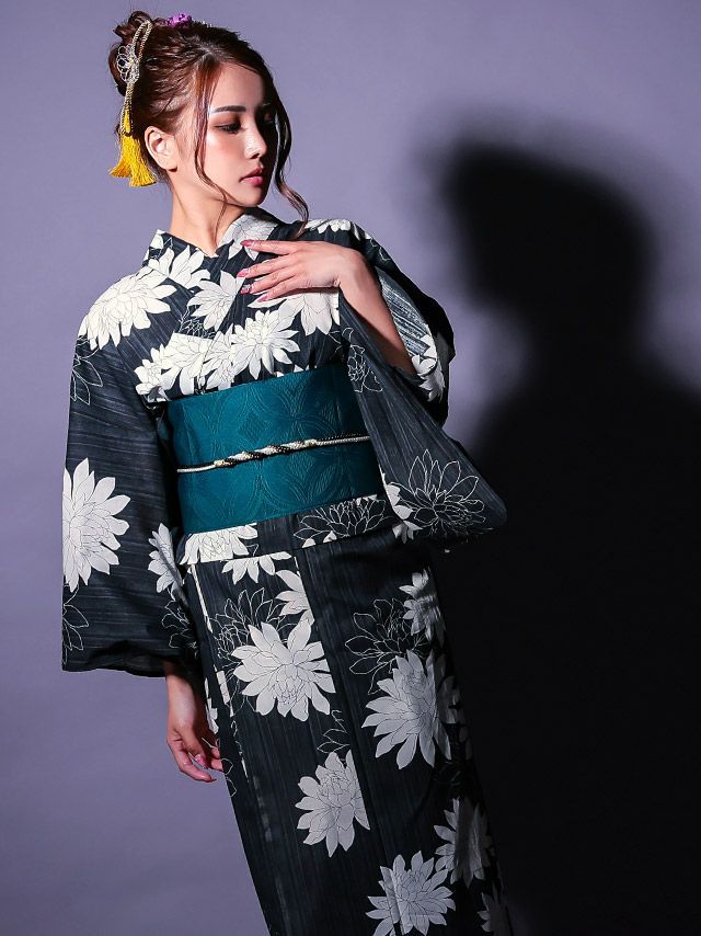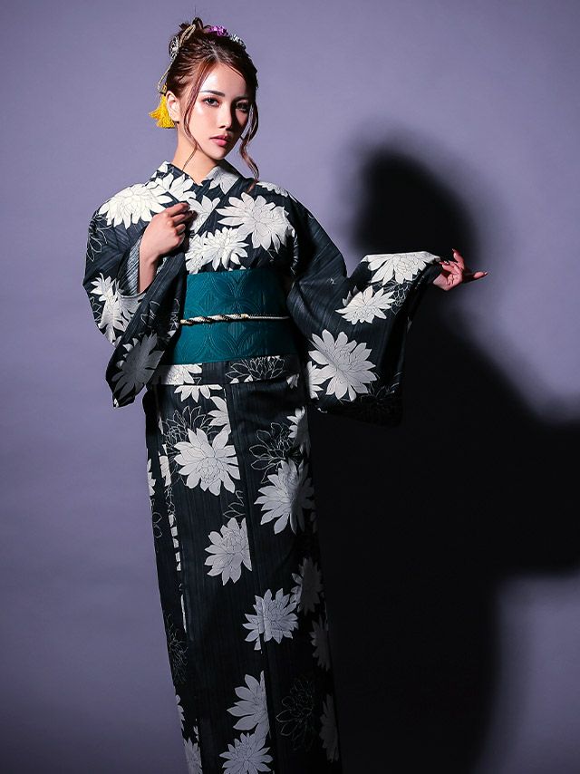 3. [セパレート浴衣] モノトーン ダリア 黒地 2025 粋シリーズ 二部式 簡単 一人で着れる 3点セット (ゆかた・作り帯・下駄)