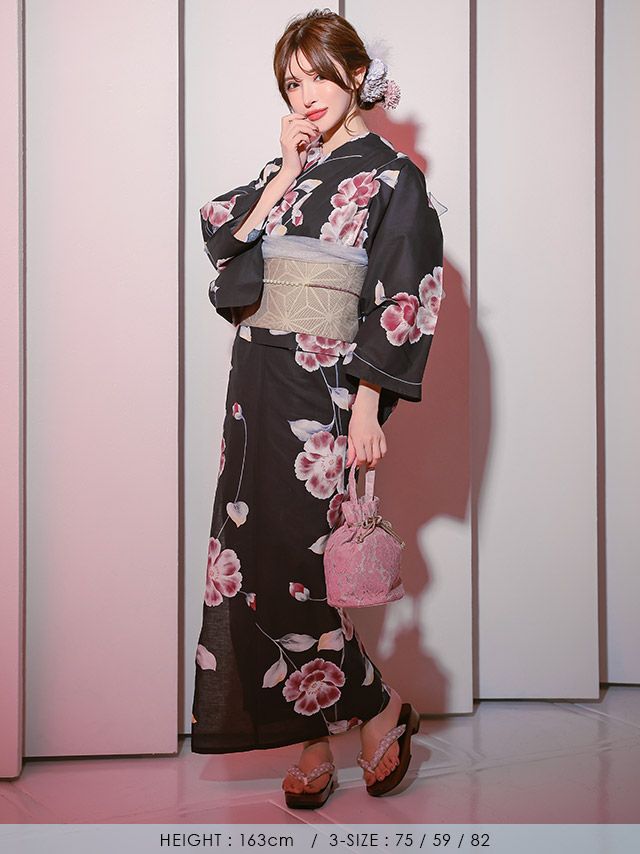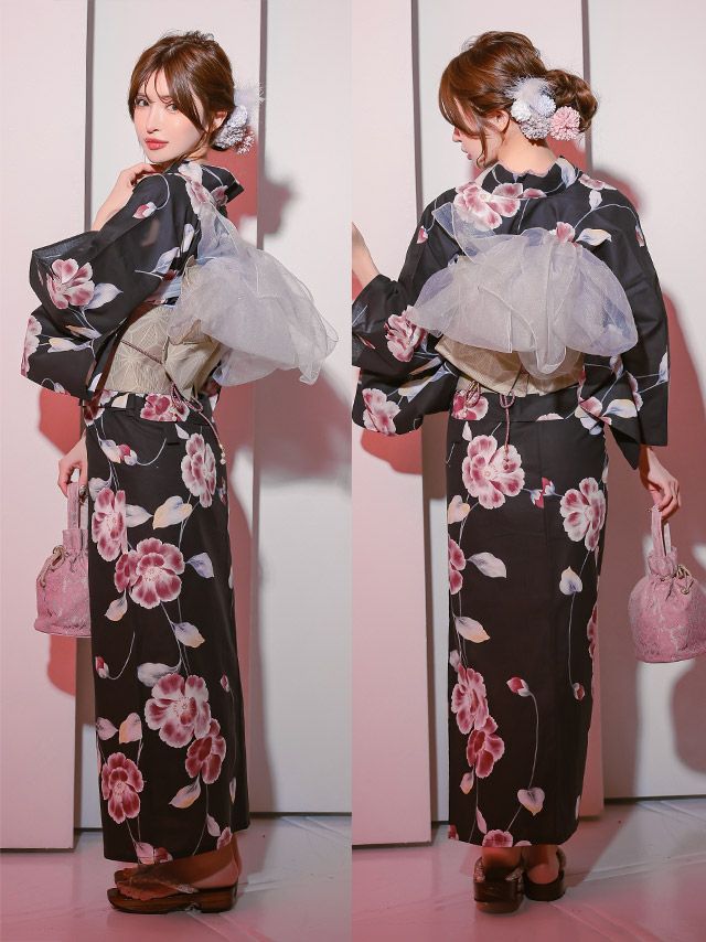 妖艶 黒地 グラデーション シャクナゲ セパレート ゆかた3点セット内容
