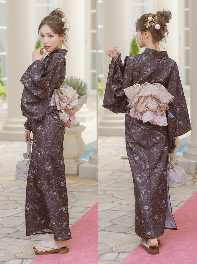 モノトーン線画フラワー ゆかた3点セットの全身フロント画像