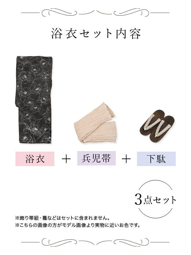 モノトーン線画フラワー ゆかた3点セットのセット内容