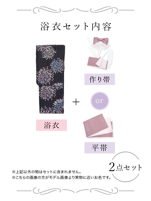 レトロ紺地×ピンク花火ゆかた3点セットのブラックセット内容