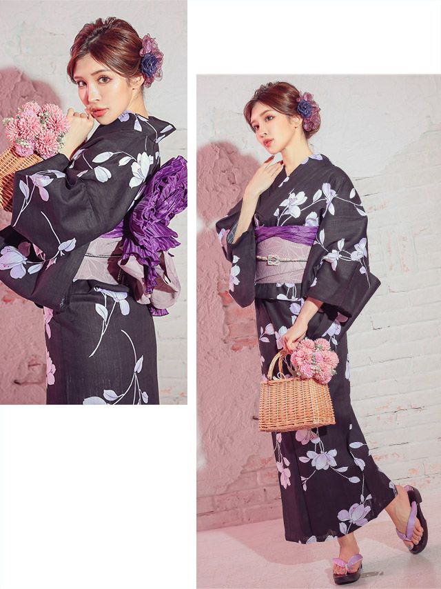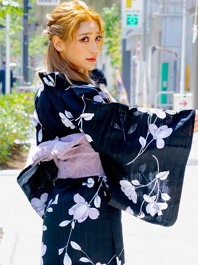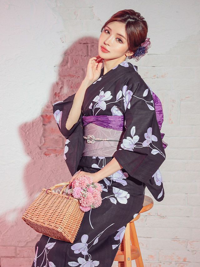 妖艶 黒地×紫菖蒲 ゆかた3点セット内容