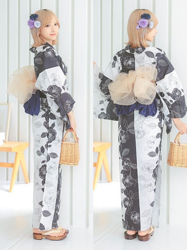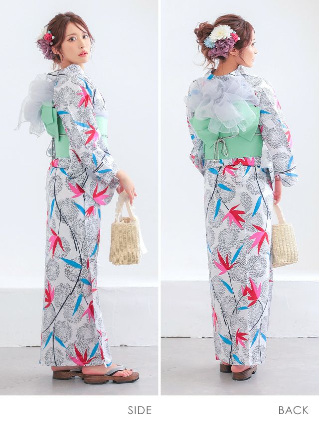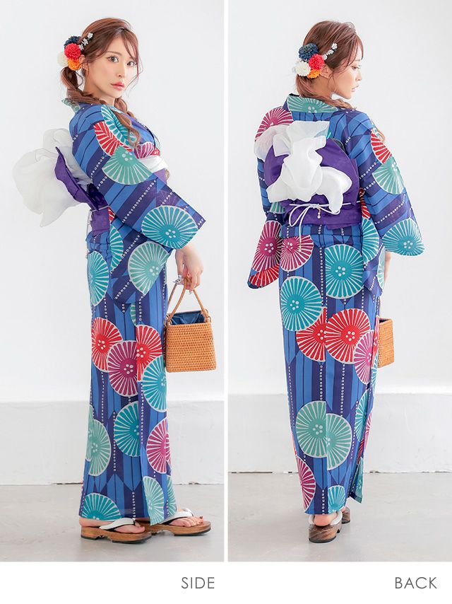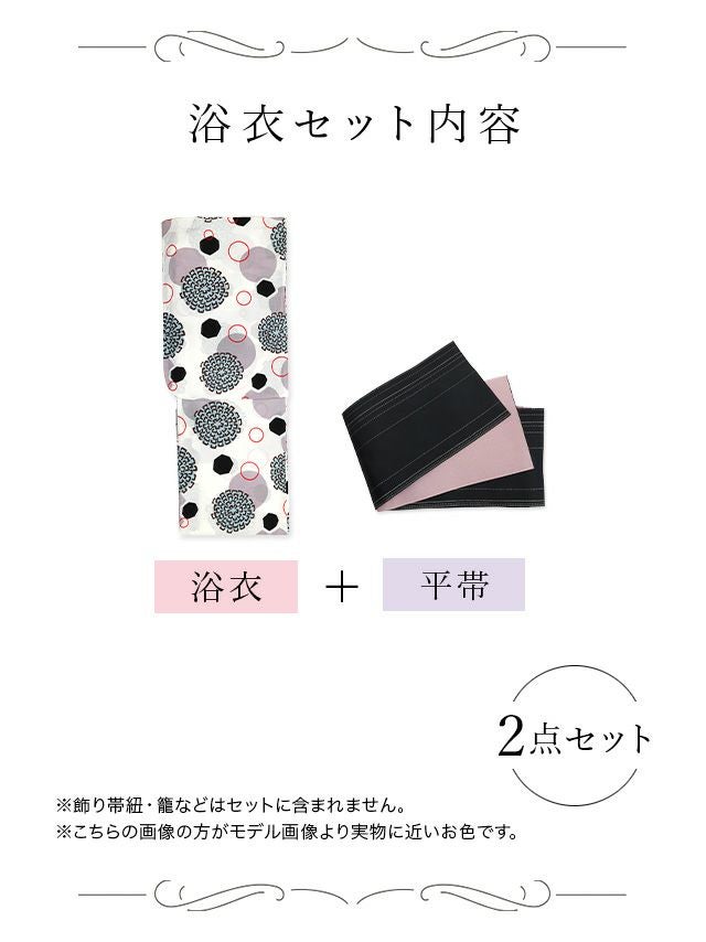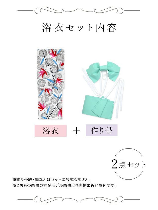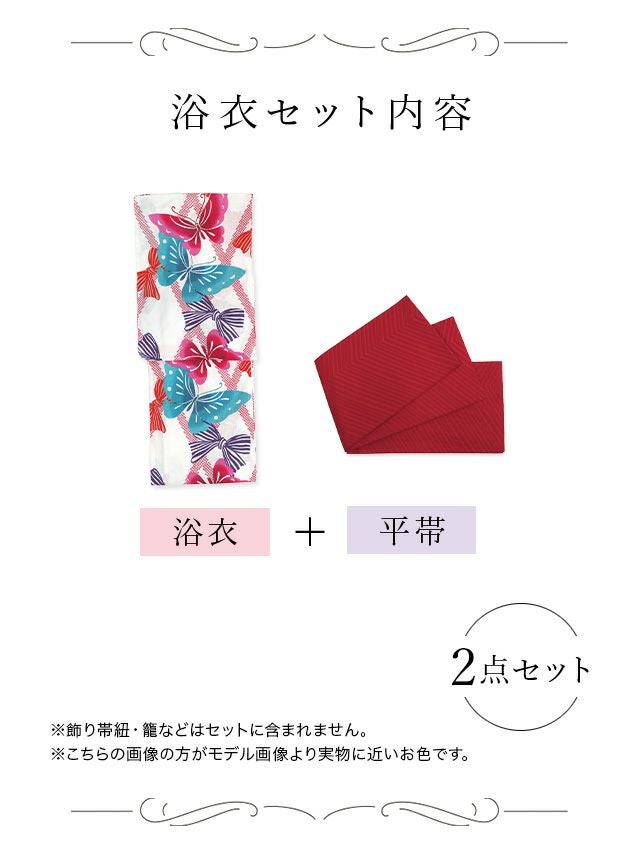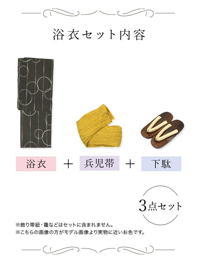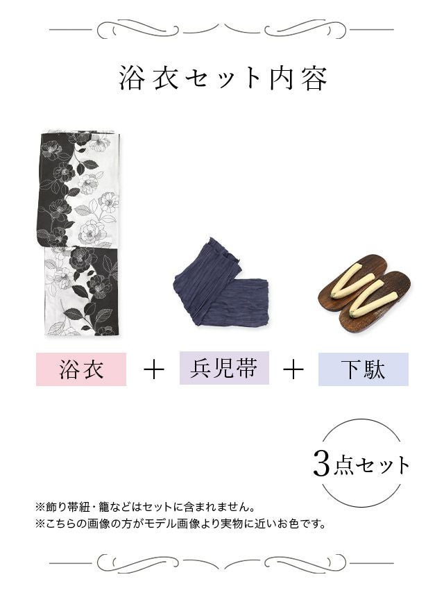 多くの浴衣は「浴衣+帯」または「浴衣+帯+下駄」の3点セットになっています。商品ごとにセット内容が異なるため、各ページの詳細をご確認ください。