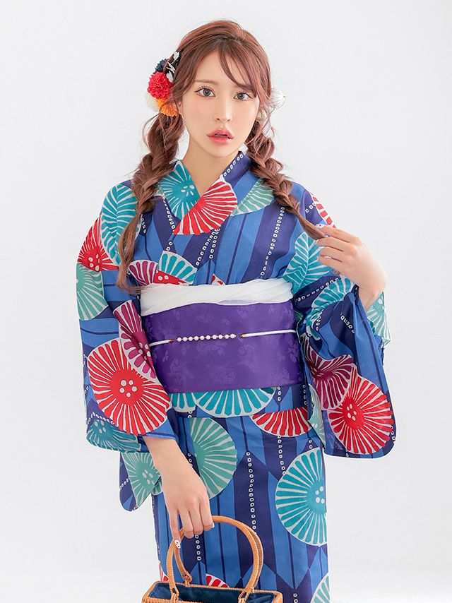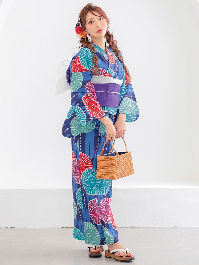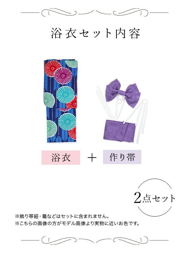 プチプラ 青地 × カラフル 菊柄 レトロ ストライプ ゆかた 2点セットのセット内容