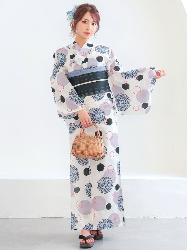 プチプラ 白色地 × レトロ モダン 和柄 ゆかた 2点セットの全身フロント画像