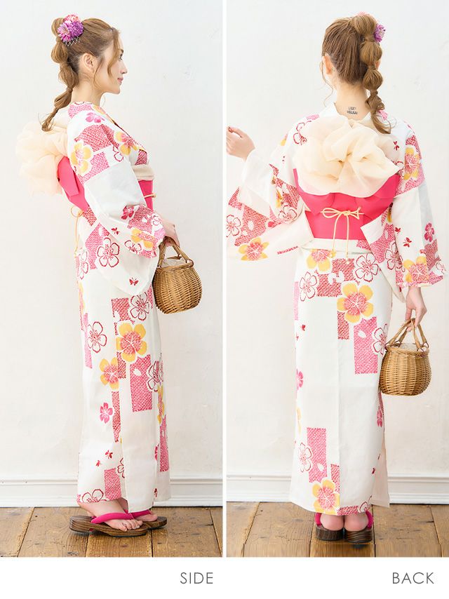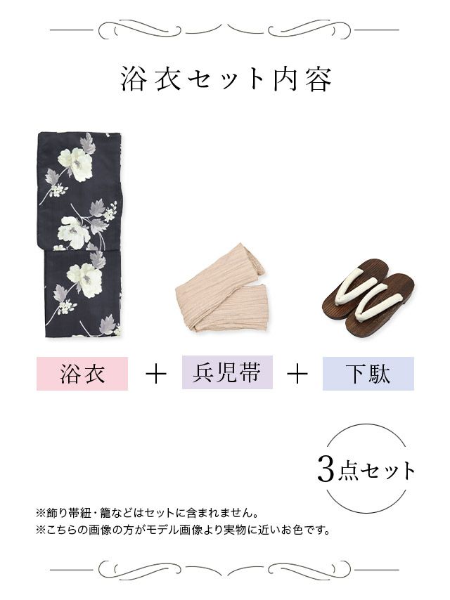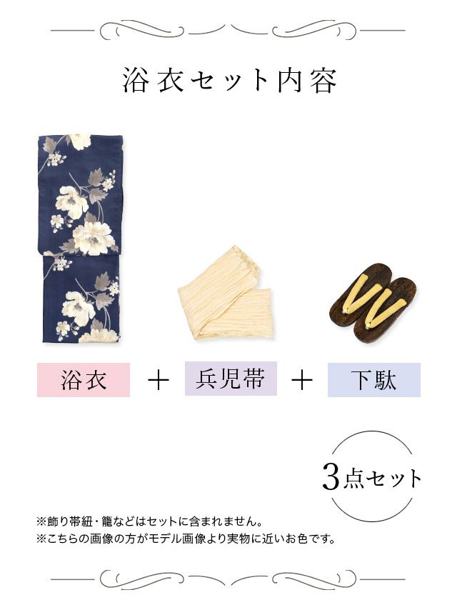 多くの浴衣は「浴衣+帯」または「浴衣+帯+下駄」の3点セットになっています。商品ごとにセット内容が異なるため、各ページの詳細をご確認ください。