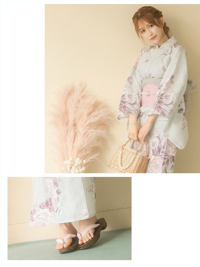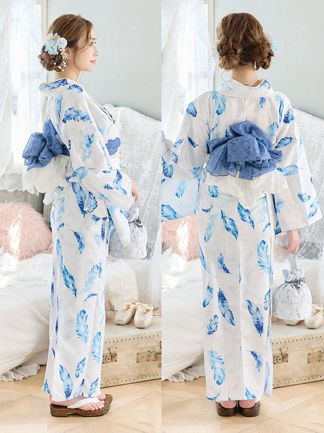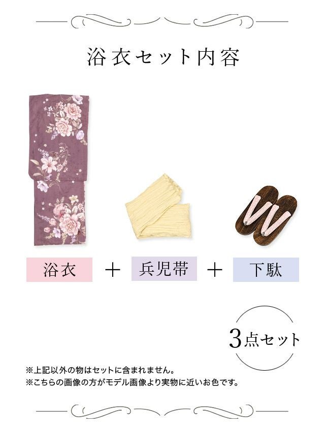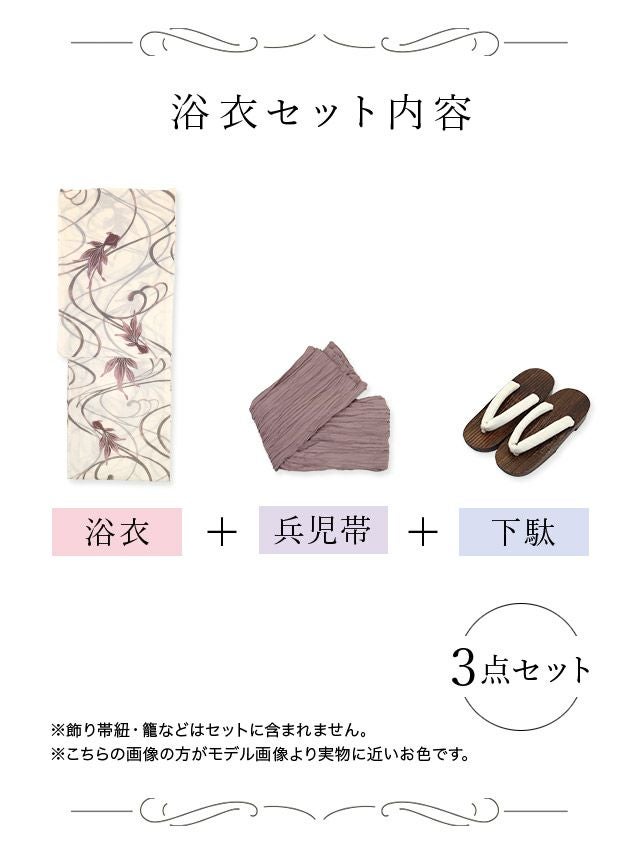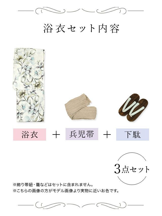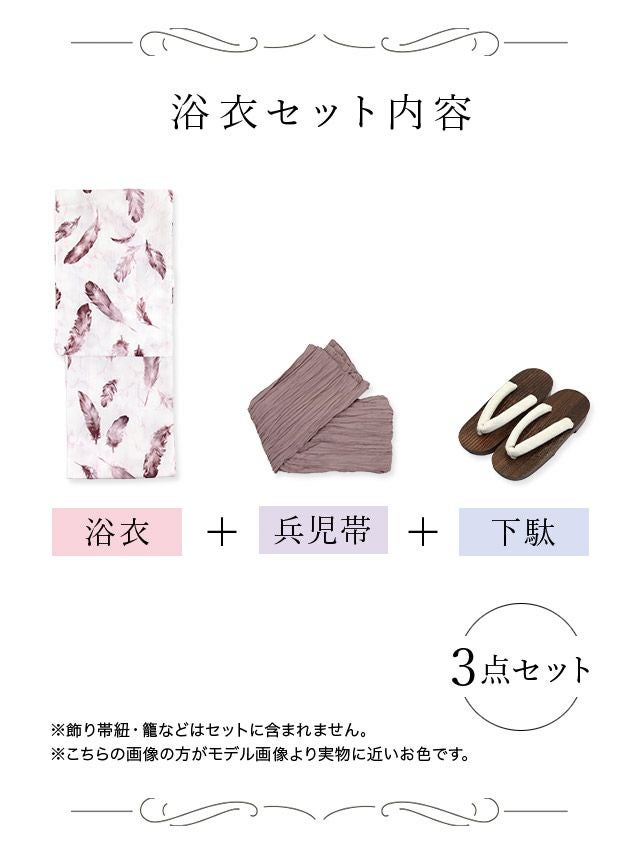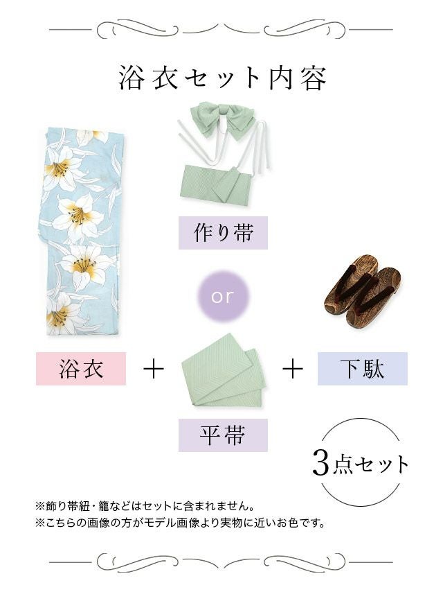 多くの浴衣は「浴衣+帯」または「浴衣+帯+下駄」の3点セットになっています。商品ごとにセット内容が異なるため、各ページの詳細をご確認ください。