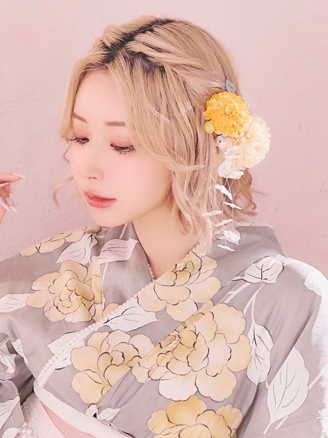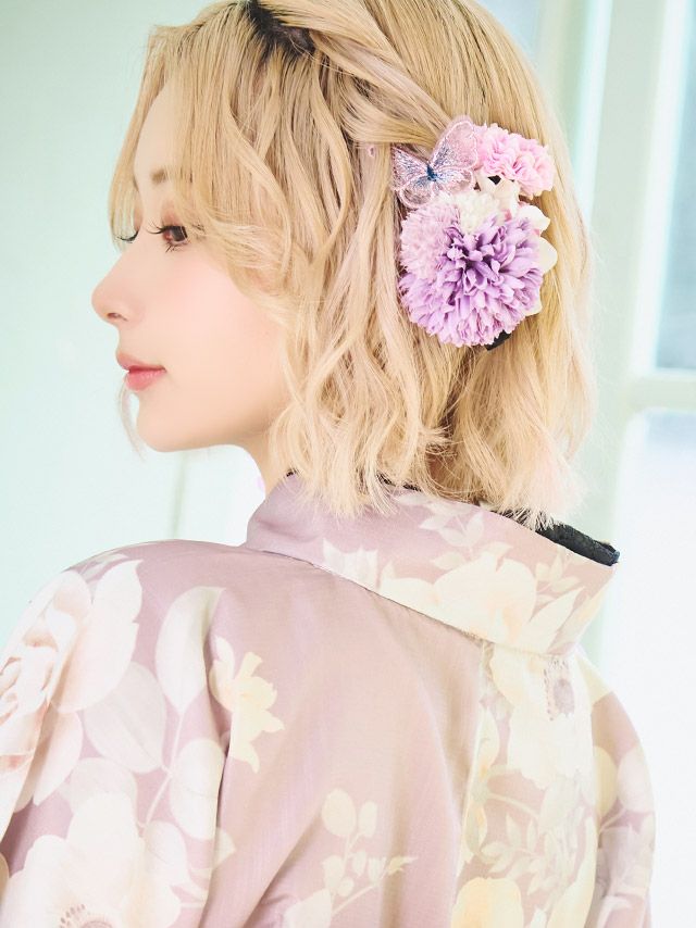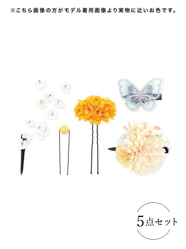 3. [浴衣小物] 髪飾り ニュアンスコサージュ垂れバタフライヘアアクセサリー5点セット (イエローセット/パープルセット/ブルーセット)