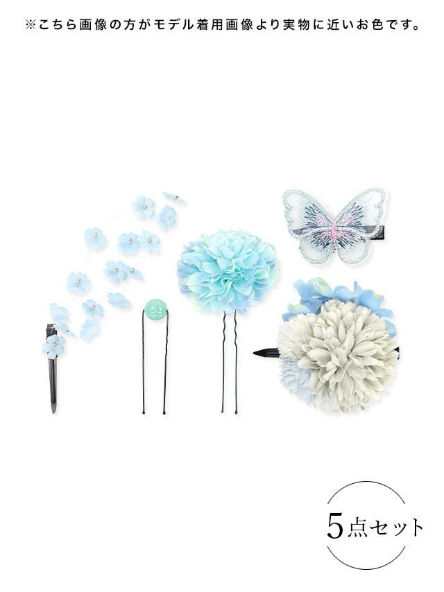 5. [浴衣小物] 髪飾り ニュアンスコサージュ垂れバタフライヘアアクセサリー5点セット (イエローセット/パープルセット/ブルーセット)