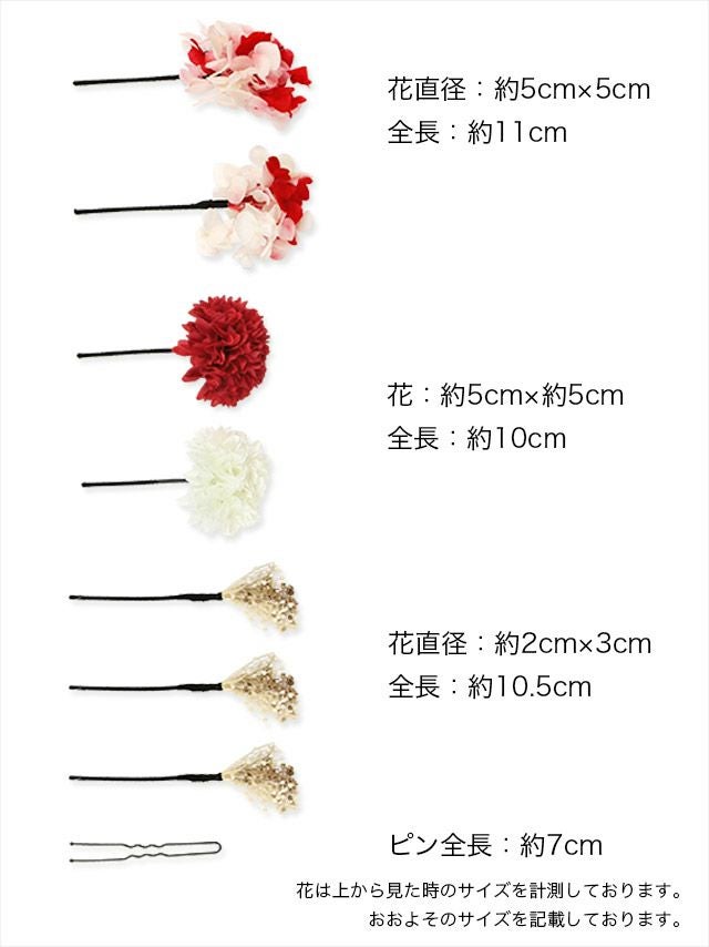 金箔×和玉×ロープ紐リボンタッセル付きダリアマム浴衣ヘアアクセサリー15点セットのサイズ表2