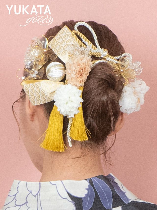 金箔×和玉×ロープ紐リボンタッセル付きダリアマム浴衣ヘアアクセサリー15点セット