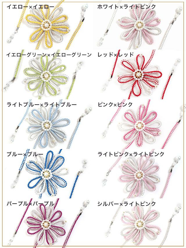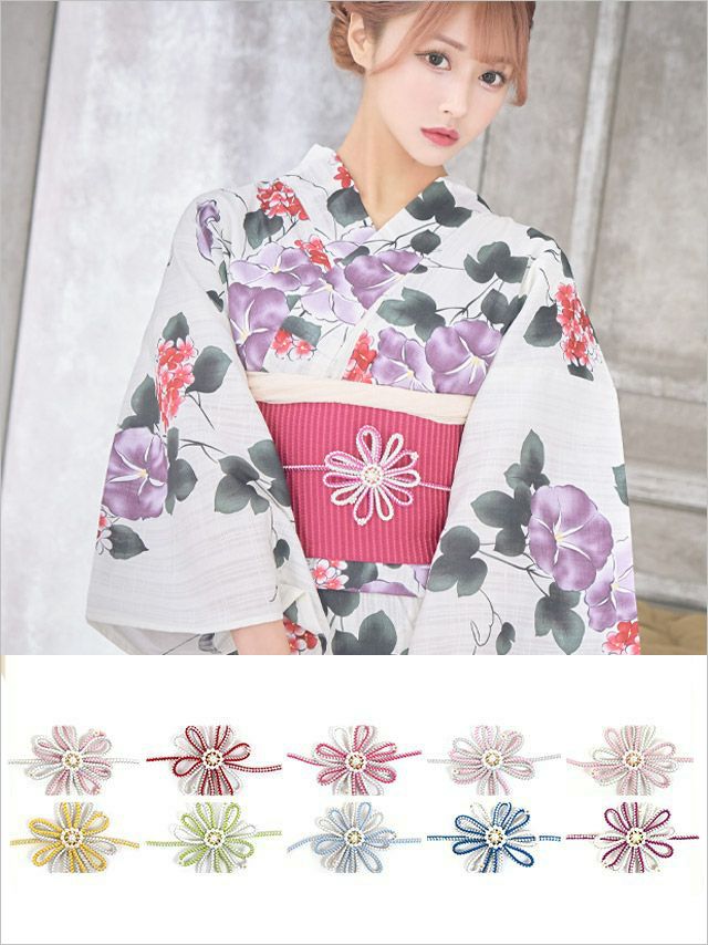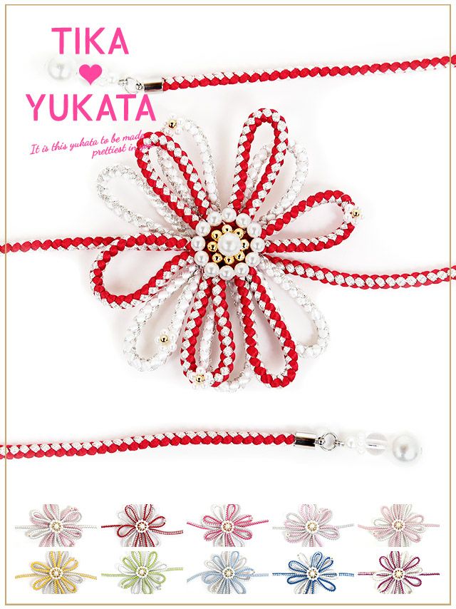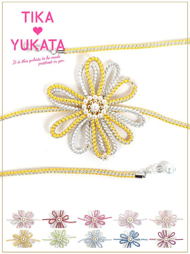 4. [浴衣小物] パール付き立体フラワーデザイン飾り帯紐 10色展開 (ホワイト/イエロー/イエローグリーン/ライトブルー/ブルー/パープル/レッド/ピンク/ライトピンク/シルバー)